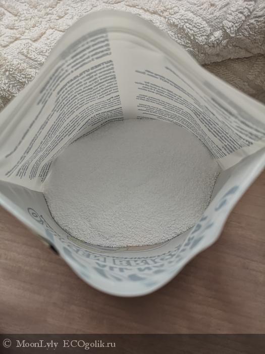 Отбеливатель Nellie's находится в плотном полупрозрачном пластиковом пакете объёмом 800 г. Для удобства использования пакет снабжён зип-застёжкой. В комплекте есть пластиковая мерная ложка.