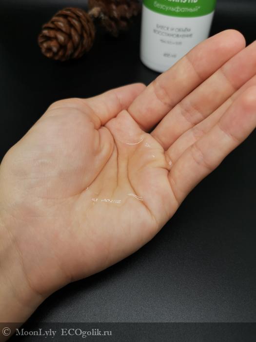 Шампунь прозрачный и бесцветный, по консистенции в меру жидкий (сквозь пальцы не убегает).
