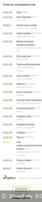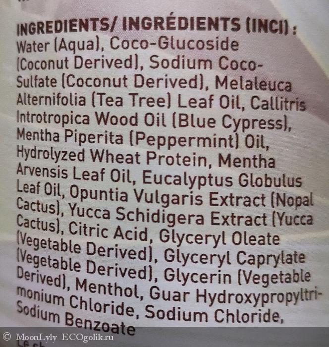 Шампунь густой, прозрачный, бесцветный. Пахнет чайным деревом и мятой. Хорошо пенится, расход экономичный. После смывания остаётся прикольный холодок на коже.