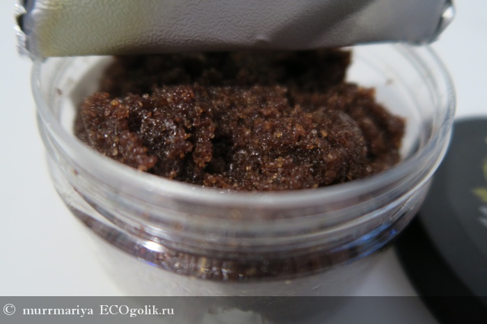 Скраб сделан на основе сахара - при использовании он понемногу растворяется в руках, что мне очень понравилось. Но есть и небольшой минус в этом - слишком быстро заканчивается скраб.