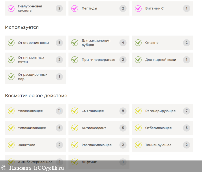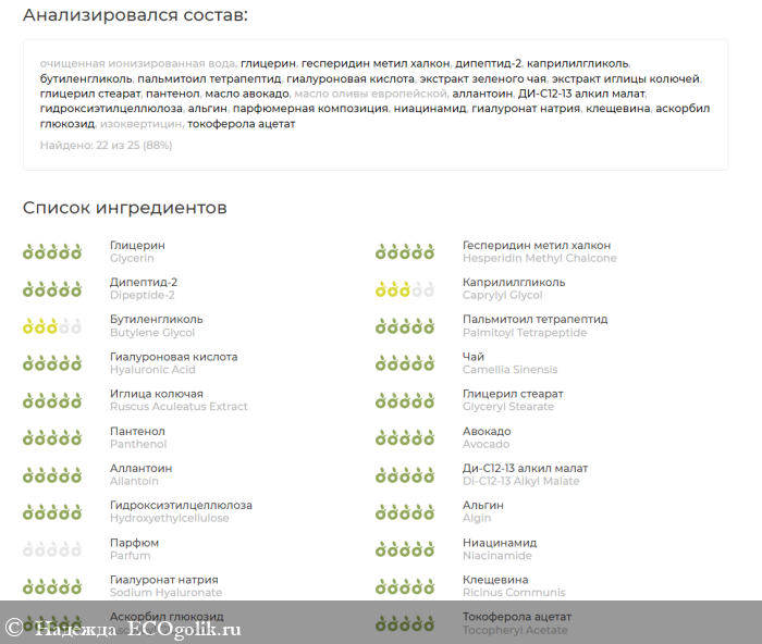 Сыворотка имеет натуральный, одобренный сервисом проверки СОСТАВ: очищенная ионизированная вода, глицерин, гесперидин метил халкон, дипептид-2, каприлилгликоль, бутиленгликоль, пальмитоил тетрапептид, гиалуроновая кислота, экстракт зеленого чая, экстракт иглицы колючей, глицерил стеарат, пантенол, масло авокадо, масло оливы европейской, аллантоин, ДИ-С12-13 алкил малат, гидроксиэтилцеллюлоза, альгин, парфюмерная композиция, ниацинамид, гиалуронат натрия, клещевина, аскорбил глюкозид, изоквертицин, токоферола ацетат.