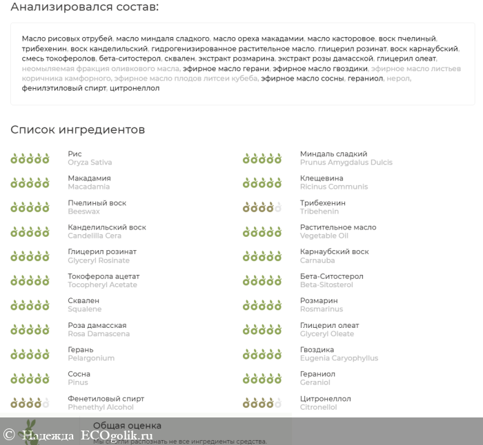 ИМЕЕТ НАТУРАЛЬНЫЙ, РАСТИТЕЛЬНЫЙ СОСТАВ:Масло рисовых отрубей, масло миндаля сладкого, масло ореха макадамии, масло касторовое1, воск пчелиный, трибехенин1, воск канделильский, гидрогенизированное растительное масло, глицерил розинат1, воск карнаубский, смесь токоферолов1, бета-ситостерол1, сквален1 (растительный), экстракт розмарина, экстракт розы дамасской, глицерил олеат1, неомыляемая фракция оливкового масла1, эфирное масло герани, эфирное масло гвоздики, эфирное масло листьев коричника камфорного (дерева хо), эфирное масло плодов литсеи кубеба, эфирное масло сосны, гераниол2, нерол2, фенилэтиловый спирт2, цитронеллол2.
