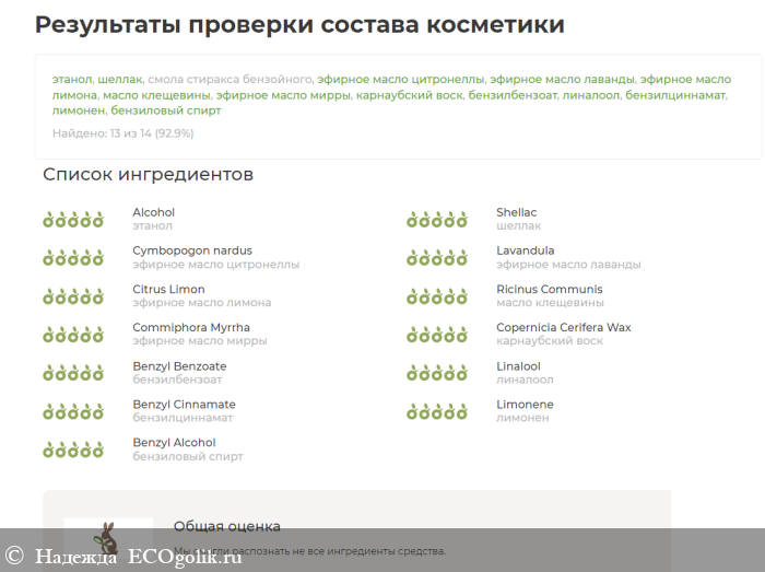 СОСТАВ: этанол (Demeter)**, шеллак, смола стиракса бензойного, эфирное масло цитронеллы*, эфирное масло лаванды**, эфирное масло лимона**, масло клещевины*, эфирное масло мирры, карнаубский воск, смесь натуральных эфирных масел (бензилбензоат, линалоол, бензилциннамат, лимонен, бензиловый спирт).