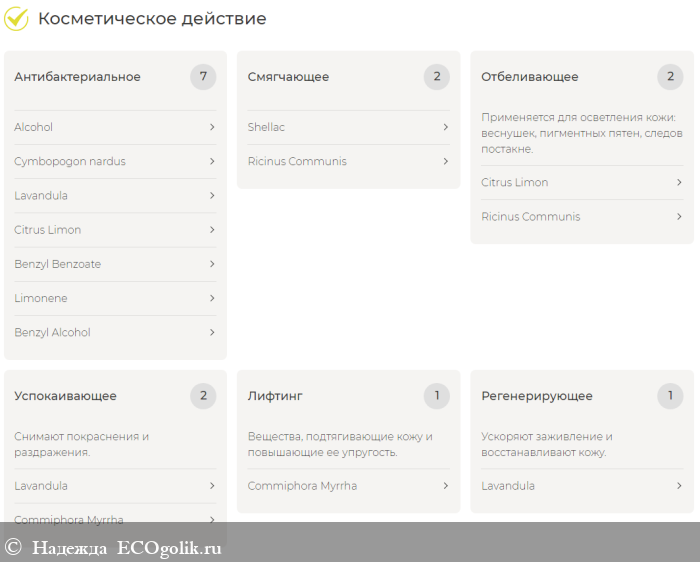 Благотворно действует на кожу, обладает антисептическими и противовоспалительным свойством