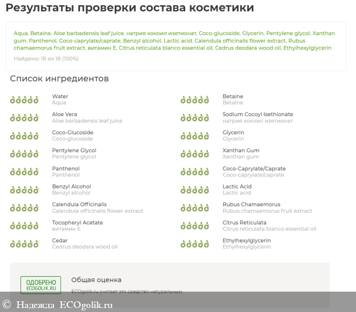 Сервис проверки оценил на ОТЛИЧНО все ингредиенты геля для умывания: