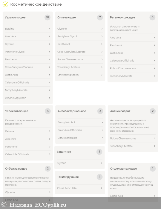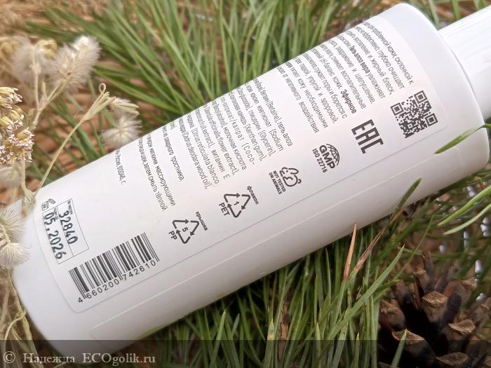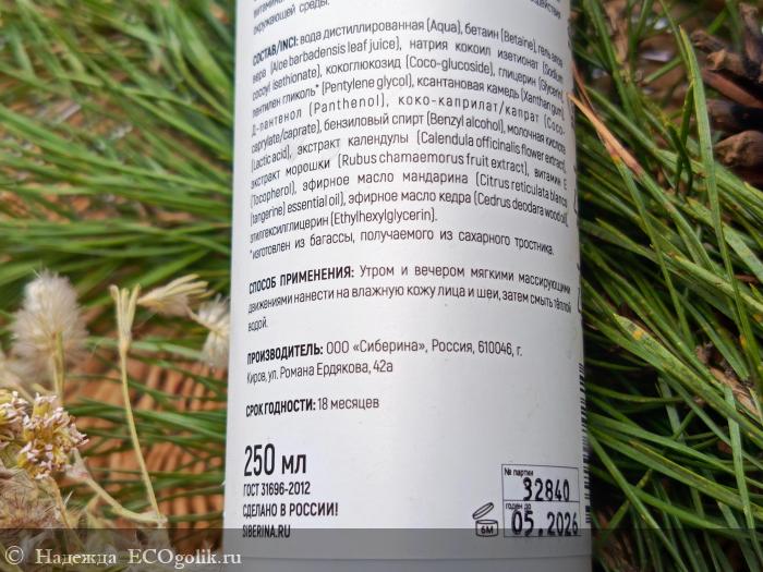 Состав:Aqua (вода дистиллированная), Betaine (бетаин), Aloe barbadensis leaf juice (гель алоэ вера), Sodium сocoyl isethionate (натрия кокоил изетионат), Coco-glucoside (кокоглюкозид), Glycerin (глицерин растительный), Pentylene glycol (пентилен гликоль), Xanthan gum (ксантановая камедь), Panthenol (Д-пантенол), Coco-caprylate/caprate (коко-каприлат/капрат), Benzyl alcohol (бензиловый спирт), Lactic acid (молочная кислота), Calendula officinalis flower extract (экстракт календулы), Rubus chamaemorus fruit extract (экстракт морошки), Tocopheryl аcetate (витамин Е), Citrus reticulata blanco (tangerine) essential oil (эфирное масло мандарина), Cedrus deodara wood oil (эфирное масло кедра), Ethylhexylglycerin (этилгексилглицерин). *изготовлен из багассы, получаемого из сахарного тростника.