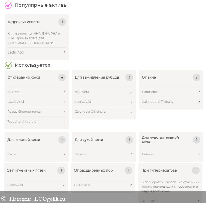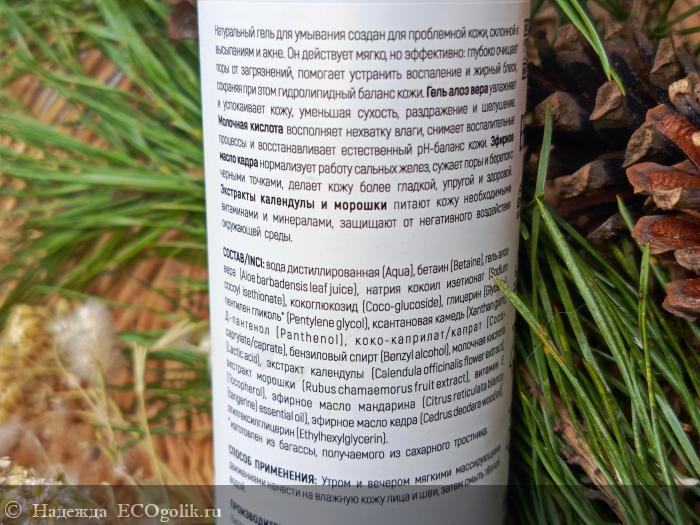 "ГЕЛЬ АЛОЭ ВЕРА увлажняет и успокаивает кожу, уменьшая сухость, раздражение и шелушение. МОЛОЧНАЯ КИСЛОТА восполняет нехватку влаги, снимает воспалительные процессы и восстанавливает естественный рН-баланс кожи. ЭФИРНОЕ МАСЛО КЕДРА нормализует работу сальных желез, сужает поры и борется с черными точками, делает кожу более гладкой, упругой и здоровой. ЭКСТРАКТЫ КАЛЕНДУЛЫ И МОРОШКИ питают кожу необходимыми витаминами и минералами, защищают от негативного воздействия окружающей среды".