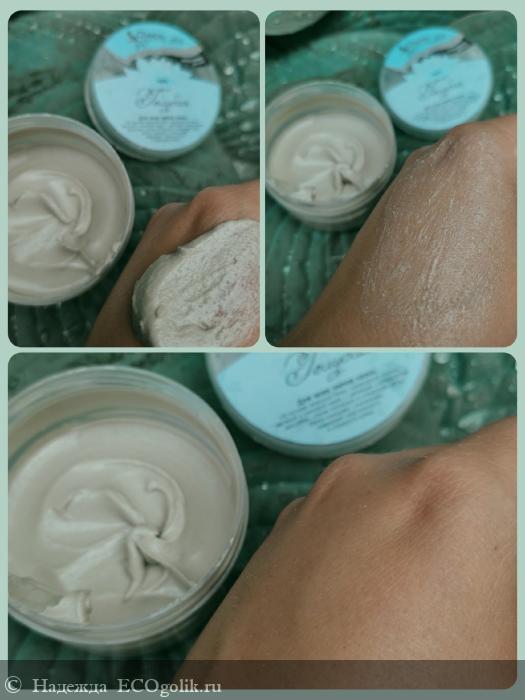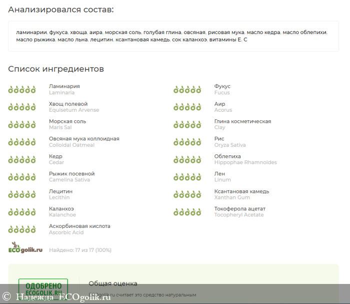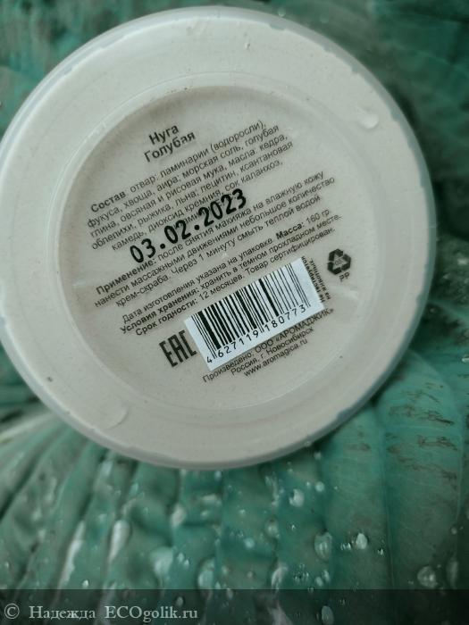 Конечно в первую очередь меня привлёк в нём полностью натуральный, интересный состав: отвар: ламинарии, фукуса, хвоща, аира; морская соль, голубая глина, овсяная и рисовая мука; масла: кедра, облепихи, рыжика, льна; лецитин, ксантановая камедь, пилинг; сок каланхоэ; витамины Е, С. (Соль является природным консервантом)