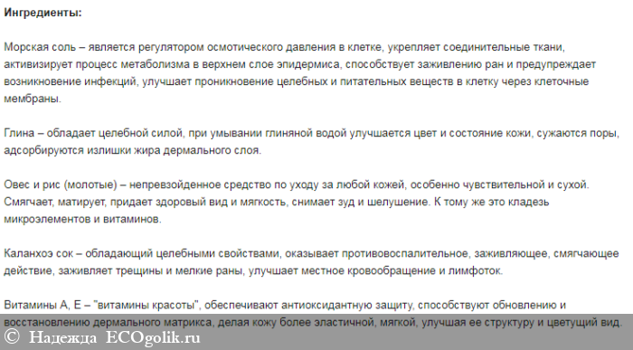 На сайте производителя очень хорошее описание действия активных ингредиентов крем-скраба: