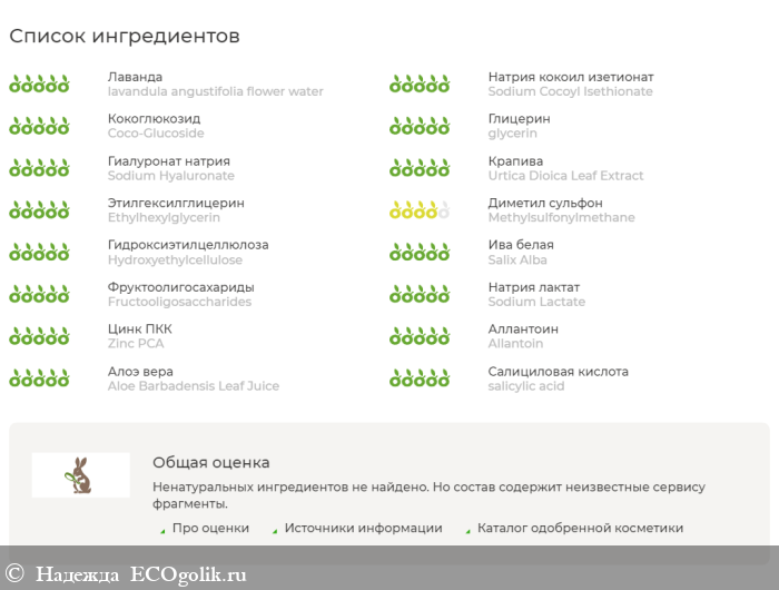 lavandula angustifolia flower water (гидролат лаванды); Sodium Cocoyl Isethionate(Изетионат натрия); Coco-Glucoside (Коко-Глюкозид); glycerin (глицерин); Sodium Hyaluronate (Гиалуронат Натрия); Melaleuca Alternifolia (Tea Tree); Extract (Экстракт чайного дерева); Urtica Dioica Leaf Extract (экстракт крапивы); Ethylhexylglycerin (этилгексилглицерин); Citrus Paradise Extract (Экстракт грейпфрута); Methylsulfonylmethane (Сера МСМ); Hydroxyethylcellulose (гидроксиэтилцеллюлоза); Salix Alba (White Willow); Bark Extract (Экстракт ивы); Fructooligosaccharides (Фруктоолигосахариды); Sodium Lactate (Лактат натрия); Zinc PCA (Цинк РСА); Allantoin (аллантоин); Aloe Barbadensis Leaf Juice (Алоэ вера гель); salicylic acid (салициловая кислота)