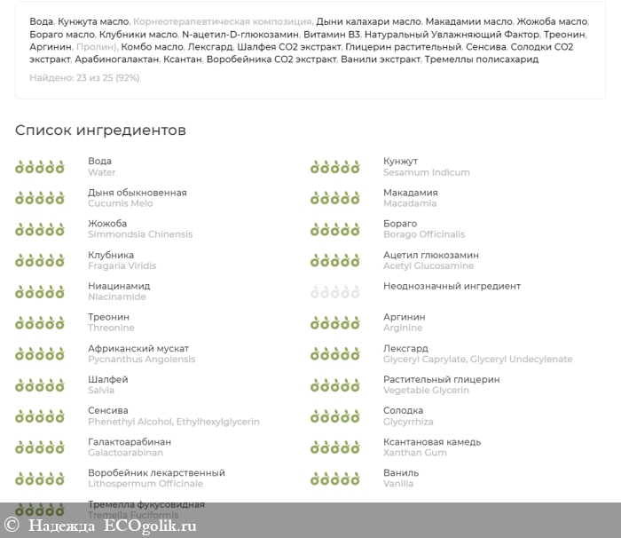 Состав: Вода, Кунжута масло, Корнеотерапевтическая композиция (Гидрированный фосфатидилхолин, Фитостеролы, Церамиды), Дыни калахари масло, Макадамии масло, Жожоба масло, Бораго масло, Клубники масло, N-ацетил-D-глюкозамин, Витамин В3 (ниацинамид), Натуральный Увлажняющий Фактор (Бетаин, Натрия РСА, Натрия лактат, Пирролидон карбоксилат, Серин, Аланин, Глицин, Глютаминовая кислота, Лизин (гидрохлорид), Треонин, Аргинин, Пролин), Комбо масло, Лексгард (Глицерил каприлат, Глицерил ундециленат), Шалфея CO2 экстракт, Глицерин растительный, Сенсива (Фенилэтиловый спирт, Этилгексилглицерин), Солодки СО2 экстракт, Арабиногалактан (пребиотик), Ксантан, Воробейника СО2 экстракт, Ванили экстракт, Тремеллы полисахарид.
