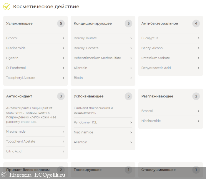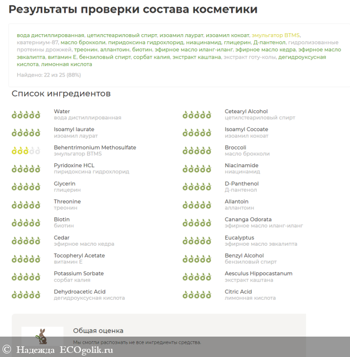 Состав кондиционера: вода дистиллированная (Aqua), цетилстеариловый спирт (Cetearyl alcohol), изоамил лаурат (Isoamyl laurate), изоамил кокоат (Isoamyl cocoate), эмульгатор BTMS (Behentrimonium methosulfate), кватерниум-87 (Quaternium-87), масло брокколи (Brassica oleracea italica seed oil), пиридоксина гидрохлорид (Pyridoxine HCl), ниацинамид (Niacinamide), глицерин (Glycerin), Д-пантенол (Panthenol), гидролизованные протеины дрожжей (Hydrolyzed yeast protein), треонин (Threonine), аллантоин (Allantoin), биотин (Biotin), эфирное масло иланг-иланг (Ylang-ylang essential oil), эфирное масло кедра (Cedarwood siberian essential oil), эфирное масло эвкалипта (Eucalyptus globulus essential oil), витамин Е (Tocopherol), бензиловый спирт (Benzyl alcohol), сорбат калия (Potassium sorbate), экстракт каштана (Аesculus hippocastanum leaf extract), экстракт готу-колы (Centella asiatica root extract), дегидроуксусная кислота (Dehydroacetic acid), лимонная кислота (Citric acid).
