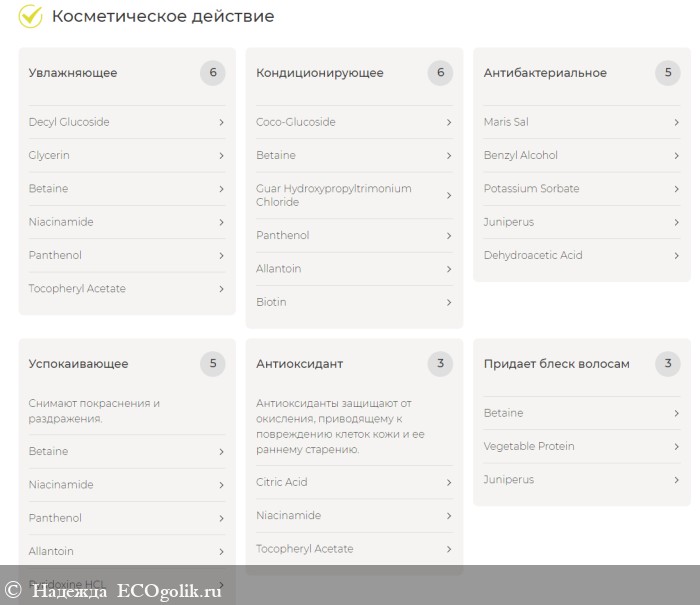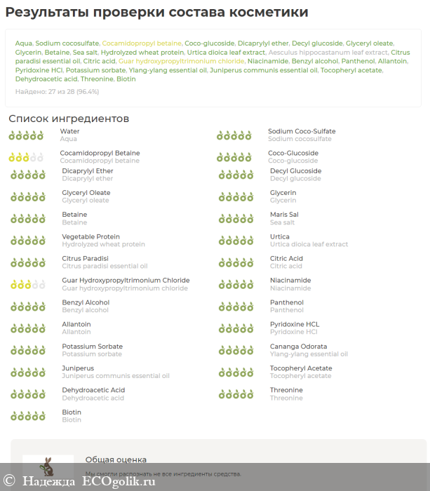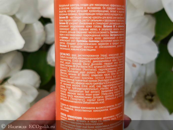 СОСТАВ ШАМПУНЯ: Aqua (вода дистиллированная), Sodium cocosulfate* (кокосульфат натрия), Cocamidopropyl betaine (кокамидопропилбетаин), Coco-glucoside (кокоглюкозид), Dicaprylyl ether (дикаприлиловый эфир), Decyl glucoside (децил глюкозид), Glyceryl oleate (глицерил олеат), Glycerin (глицерин растительный), Betaine (бетаин), Sea salt (соль морская), Hydrolyzed wheat protein (гидролизованный пшеничный протеин), Urtica dioica leaf extract (экстракт крапивы), Аesculus hippocastanum leaf extract (экстракт каштана), Citrus paradisi essential oil (эфирное масло грейпфрута), Citric acid (лимонная кислота), Guar hydroxypropyltrimonium chloride (гуар гидроксипропилтримониум хлорид), Niacinamide (витамин B3), Benzyl alcohol (бензиловый спирт), Panthenol (Д-пантенол), Allantoin (аллантоин), Pyridoxine HCl (витамин B6), Potassium sorbate (сорбат калия), Ylang-ylang essential oil (эфирное масло иланг-иланг), Juniperus communis essential oil (эфирное масло можжевельника), Tocopheryl acetate (витамин Е), Dehydroacetic acid (дегидроуксусная кислота), Threonine (треонин), Biotin (витамин B7). *кокосульфат является мягким ПАВ, получаемым из кокосового масла, не является опасным SLS, разрешён международным стандартам ECOCERT