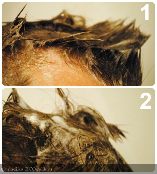 Пенообразование у шампуня хорошее. 1 - первое промывание волос, 2 - повторное.