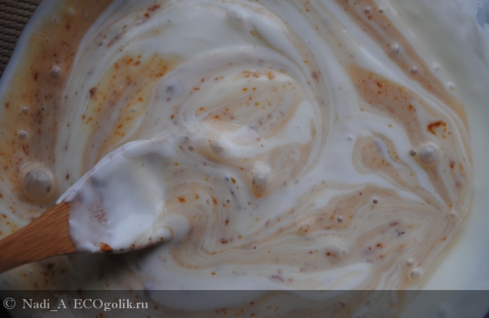Развожу с водой йогурт, так как он довольно густой, добавляю к нему ложечку мёда.