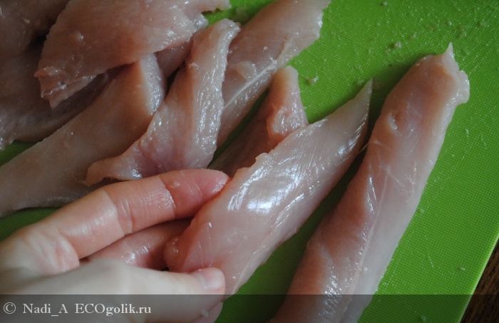 1. Куриную грудку я нарезаю произвольно тонкими полосками/ломтиками