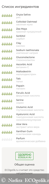 Восхитительный состав, полностью натуральный, зелёный, основа рисовая пудра. Множество полезных компонентов.