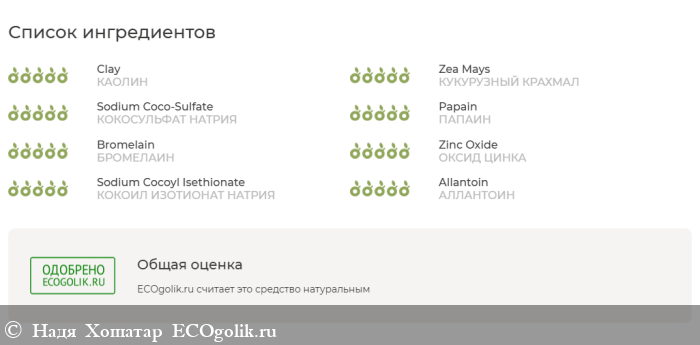 К составу пудры нет вопросов. Он натуральный. Пройдемся немного по активным компонентам. Энзим папаин помогает мягко отшелушивать и регенерировать. Бромелаин расщепляет мертвые клетки. Крахмал кукурузы делает морщины менее глубокими. Глина абсорбирует жир, убирает сухость, помогает бороться с морщинами. Спирулина и фукус – для омоложения. У оксида цинка – антибактериальный эффект. Центелла азиатская – для молодости и упругости кожи.