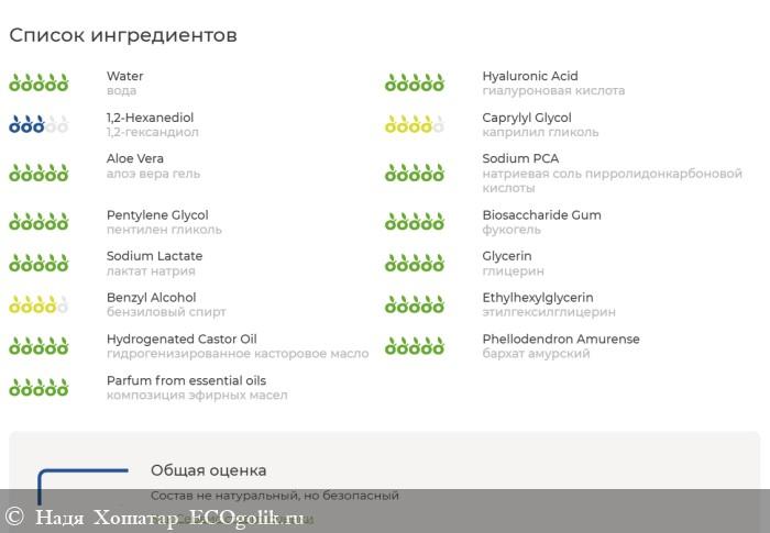 Цена доступная – 460 рублей за 100 мл. В составе отличные компоненты для поддержания гидробаланса кожи. Содержит кору амурского бархата для усиленного противовоспалительного и успокаивающего действия. Гиалуроновая кислота интенсивно увлажняет. Алое вера увлажняет и тоже успокаивает. Сильным гидратирующим действием обладает фукогель. Полезным действием на кожу обладает лактат натрия, а также экстракт бархата.