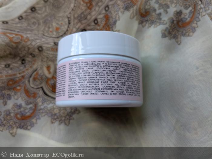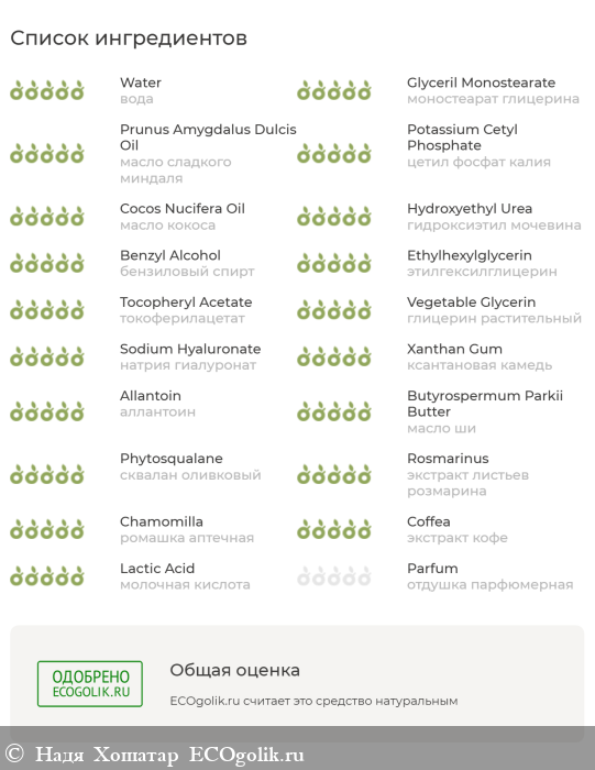 Просто отлично, что уже на третьем месте состава – масло сладкого миндаля. Мое любимое масло. Ведь оно подходит для всех типов кожи, включая чувствительную. У чувствительной кожи это масло – просто любимчик, потому успокаивает раздражения, зуд от сухости, а также восстанавливает, омолаживает. За интенсивное увлажнение отвечает оливковый сквалан, гиалуроновая кислота. Есть экстракт кофе – для упругости кожи. Также есть с восстанавливающим эффектом масла. А именно – карите и кокос. Аллантоин хорошо успокаивает кожу.