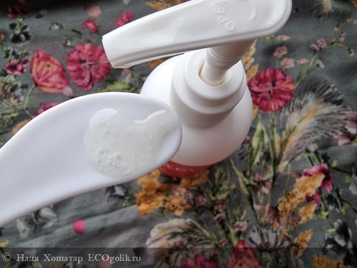 Во-первых, внешне очень привлекает внимание упаковка. Удобный формат на 200 мл, с дозатором и розовой матовой наклейкой. Не скользит в руке и приятно на ощупь. Для кинестетиков как я, это прям в удовольствие, потрогать такую бутылочку.