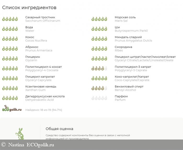 Sugar (сахар), Sea solt (морская соль), Water, Butyrospermum Parkii Oil (масло ши), Cocos Nucifera Oil (масло кокоса), Prunus dulcis oil (масло миндаля), Prunus Armeniaca Kernel Oil (масло абрикосовой косточки), Black Сurrant powder (сублимированная черная смородина), Cherry Pits (вишневые косточки), Glycerin (растительный глицерин), Glyceryl Citrate /Lactate /Linoleate/Oleate (and) Polyglyceryl-4Cocoate (and) Polyglyceryl-3 Caprate (and) Glyceryl Caprylate (растительный эмульгатор), Coco Caprylate/Caprate (растительный эмолент), Xanthan Gum, Benzyl alcohol (and) Dehydroacetic acid (консервант), Food flavoring (пищевой ароматизатор).