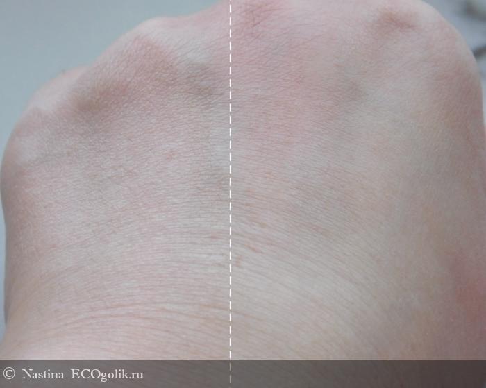 Вот здесь я попыталась запечатлеть разницу с кремом-дезодорантом и без. Справа он есть, слева нет. Слева даже можно видеть сухость и шелушения кожи, а вот справа кожа мягкая и увлажнённая, словно заблюренная, благодаря матовости.