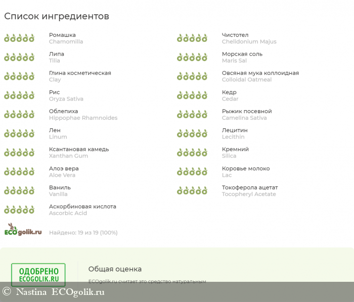 Отвары: ромашки, чистотела и цветов липы; морская соль, глина белая, овсяная и рисовая мука, масла: кедра, облепихи, рыжика, льна, лецитин, ксантановая камедь, диоксид кремния, сок алоэ, молоко сухое, ванилин, витамины Е, С.