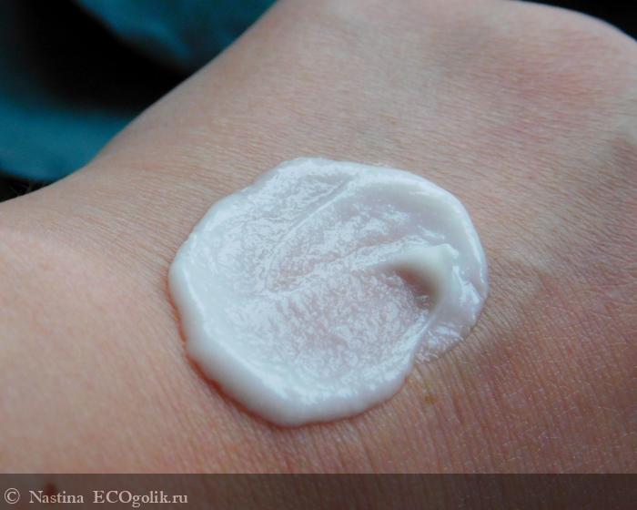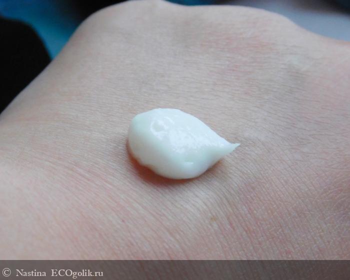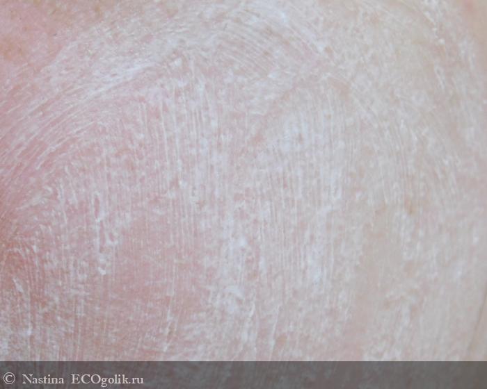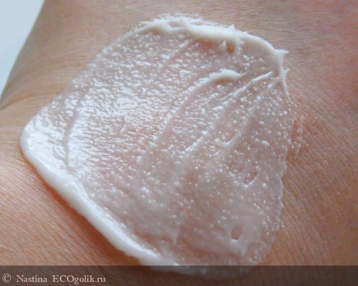 Она белая, довольно густая и плотная с виду, но легко распределяется по коже без особых усилий. Консистенция приятная, с мелкими крупинками, жирная на ощупь.
