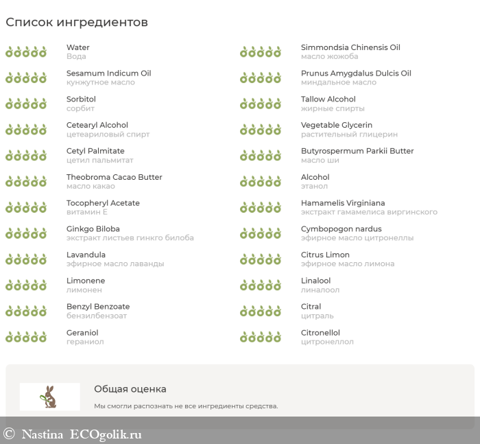 Вода, масло жожоба, масло соевых бобов,кунжутное масло, миндальное масло, сорбит, жирные спирты, цетеариловый спирт, растительный глицерин, цетил пальмитат, масло ши, масло какао, этанол, витамин E, смола стиракса бензойного, экстракт гамамелиса виргинского, экстракт листьев гинкго билоба, эфирное масло цитронеллы, эфирное масло лаванды, эфирное масло лимона, ароматическая композиция (лимонен, линалоол, бензилбензоат, цитраль, гераниол, цитронеллол).
