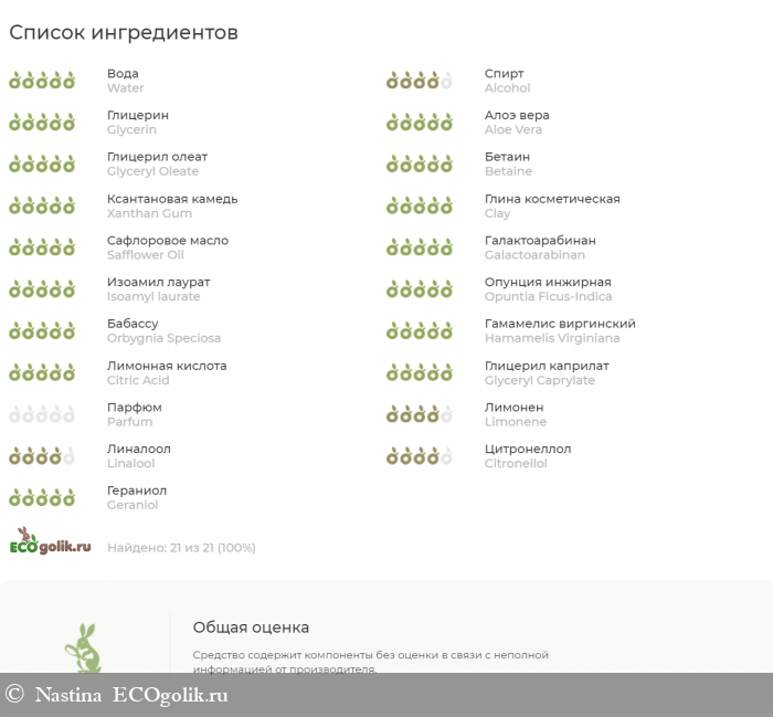 И меня слегка напугал спирт на втором месте. Но я не вижу негативной реакции со стороны кожи, поэтому для меня это оказалось совсем не критичным. Но если вы знаете, что у вас кожа реагирует на подобный состав, то лучше его избегать.