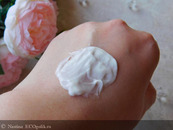 Крем на коже ощущается лёгкой вуалью, словно защищает её от внешнего воздействия. И это не то ощущение, когда чувствуешь неприятную липкую плёнку на коже, сквозь которую кожа задыхается, тут именно словно защитное действие, создающее приятную бархатистую поверхность. В общем, тактильно и по ощущениям мне очень нравится!