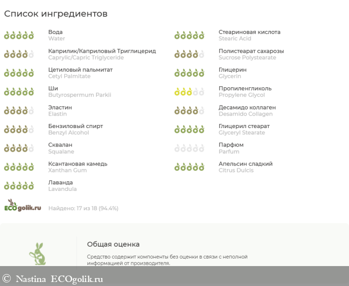 К сожалению, не все компоненты распознаны Экоголиком. Если верить интернету, компонент Carbamide – это мочевина, полученная синтетическим путём, но насколько безвреден компонент, этого я не знаю. Полный разбор состава можно посмотреть здесь.
