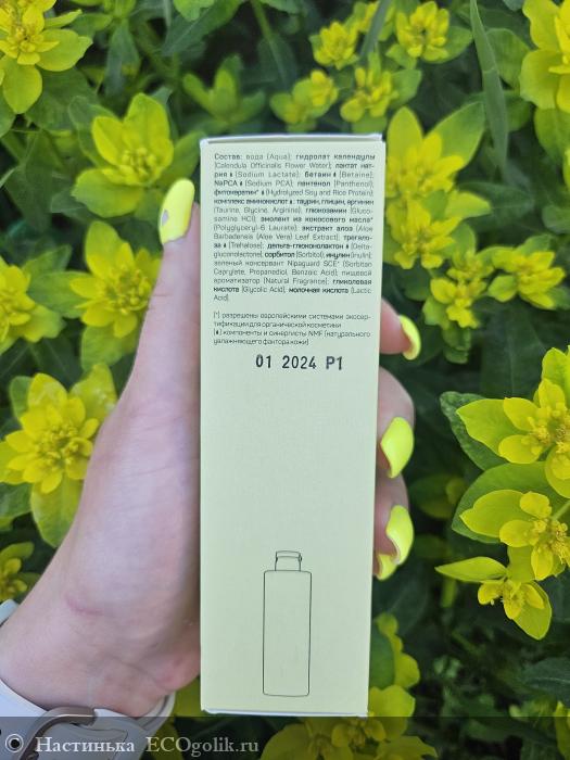 вода (Aqua); гидролат календулы (Calendula Officinalis Flower Water); лактат натрия** (Sodium Lactate); бетаин ** (Betaine); NaPCA ** (Sodium PCA); пантенол (Panthenol); фитокератин*** (Hydrolyzed Soy and Rice Protein); комплекс аминокислот** : таурин, глицин, аргинин (Taurine, Glycine, Arginine); глюкозамин (Glucosamine HCl); эмолент из кокосового масла* (Polyglyceryl-6 Laurate); экстракт алоэ (Aloe Barbadensis (Aloe Vera) Leaf Extract); трегалоза ** (Trehalose); дельта-глюконолактон** (Delta-gluconolactone); сорбитол (Sorbitol); инулин (Inulin); зеленый консервант Nipaguard SCE* (Sorbitan Caprylate, Propanediol, Benzoic Acid); пищевой ароматизатор (Natural Fragrance); гликолевая кислота (Glycolic Acid); молочная кислота (Lactic Acid).
