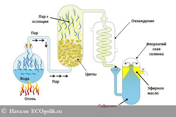 Растительный материал закладывают в сосуд с горячей водой или размещают на сетке над колбой с водой, затем колбу нагревают до высокой температуры, в результате чего пар воздействует на клетки растения, высвобождая при этом эссенцию растения в виде пара.