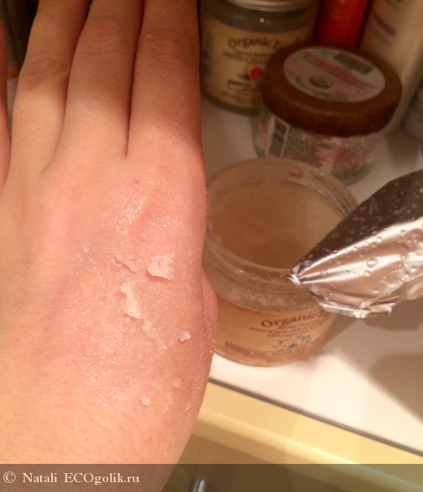 Скраб мне понравился: расходуется экономно, отшелушивает и очищает очень хорошо. Масла входящие в состав скраба оставляют небольшую жирную пленку, но после высыхания кожи она не чувствуется, все впитывается. Остаётся только гладкая, прям бархатная, и отлично увлажнённая кожа.