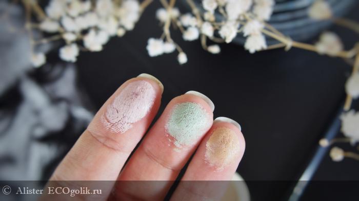В упаковке у нас три цвета: зеленый - для маскировки покраснений и прыщей; розовый - для перекрытия темных кругов под глазами и бежевый - для перекрытия прочих недостатков на коже.