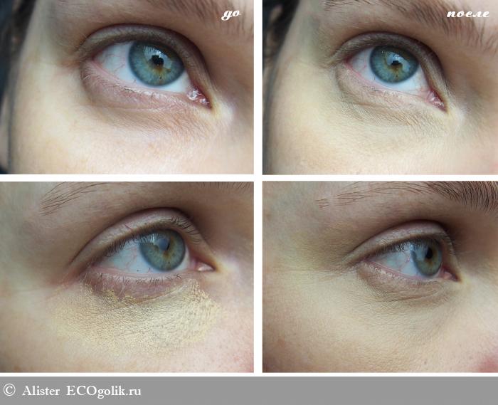 Только вот проблема в том, что ни один из цветов меня не удовлетворил. Розовый для меня слишком светлый и буквально выбеливает зону под глазами. Учитывая, что у меня нет особых проблем с темными кругами под глазами, а периодически появляется синева, то он наоборот ее подчеркивает, усиливает и придает фиолетовый оттенок. Если бы у меня был коричневый пигмент под глазами, то он бы справился на отлично, ибо розовый как раз нивелирует коричневый. Поэтому, если его и использовать, то только для перекрытия моих пигментных пятен, с чем он и справляется довольно хорошо.