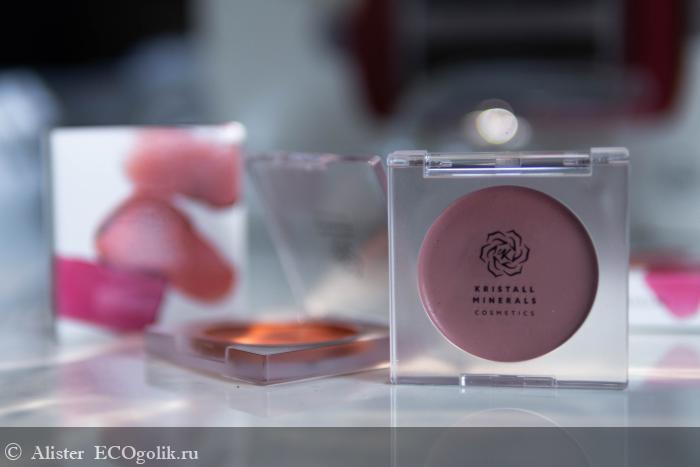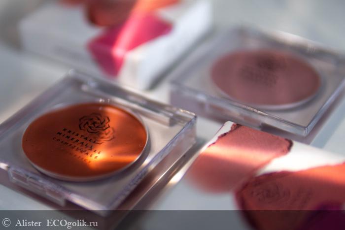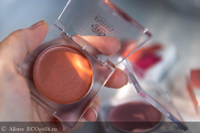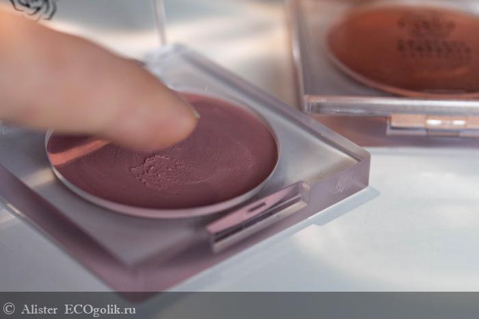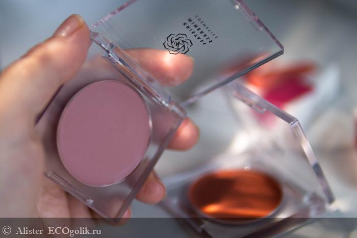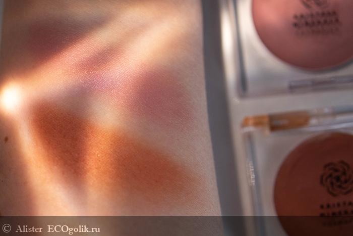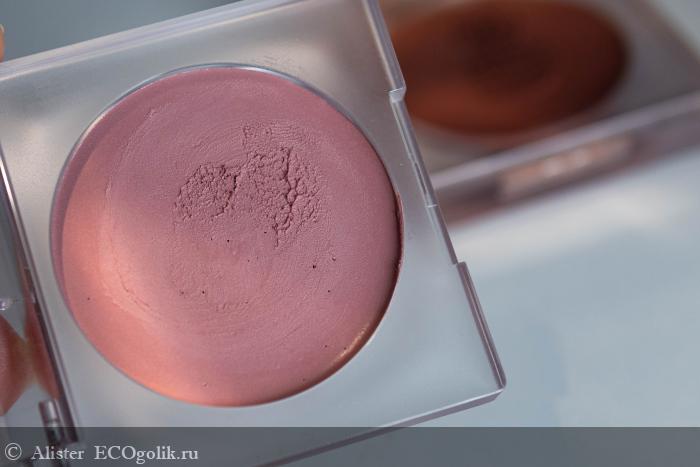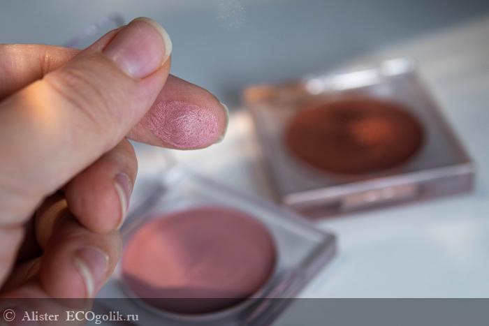 С минеральной основой мне тоже удалось их "поженить", хотя это потребует чуть большей усидчивости для красивого результата, только лишь потому, что скольжение уже не такое легкое по припудренной коже. Я аккуратненько притоптывающими движениями наношу румяна пальчиками, попутно подтушевывая границы, и наслаиваю до необходимого результата. Здесь именно лучше не растягивать, а притоптывать. Нанося на сухие текстуры, нужно более тщательно следить за границами, чтобы переход был более плавный и по необходимости их можно скорректировать в момент припудривания кистью. Покрытие не страдает и смотрится макияж гармонично.
