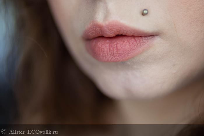 Однако, я не скажу, что он оказался комфортным в носке. Да, его легко наносить, не нужно очерчивать границы как с помадой, он не выходит за границы губ, не растекается и приятно выглядит, но я его ощущаю на губах. Он практически матовый и немного стягивает губы, хочется нанести сверху бальзам. Или же тинт следует наносить поверх ухаживающего бальзама, но тогда матовость пропадет. Без бальзама, мне показалось, что он подсушивает губы и когда сходит еще больше подчеркивает шелушения.