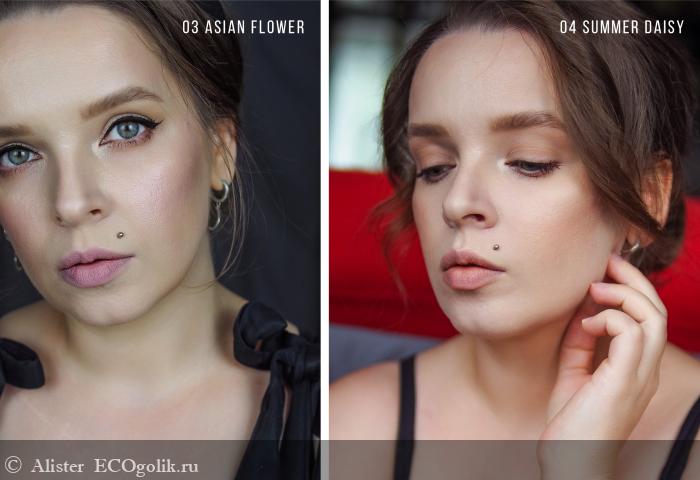 Пыльно-розовый оттенок 03 "ASIAN FLOWER" довольно освежающий, такой воздушный и очень деликатный. Он скорее подойдет для светлокожих, без плотного загара, иначе будет практически незаметен.
