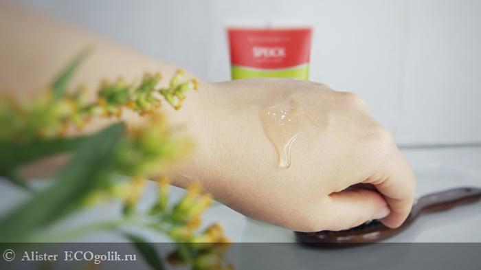 Консистенция приятная, гелевая,чуть жидковата, но из тюбика и сквозь ладошки не убегает. Пенится атас! Достаточно одной небольшой порции и вот уже вся голова в пене. Соответственно расход просто минимален.