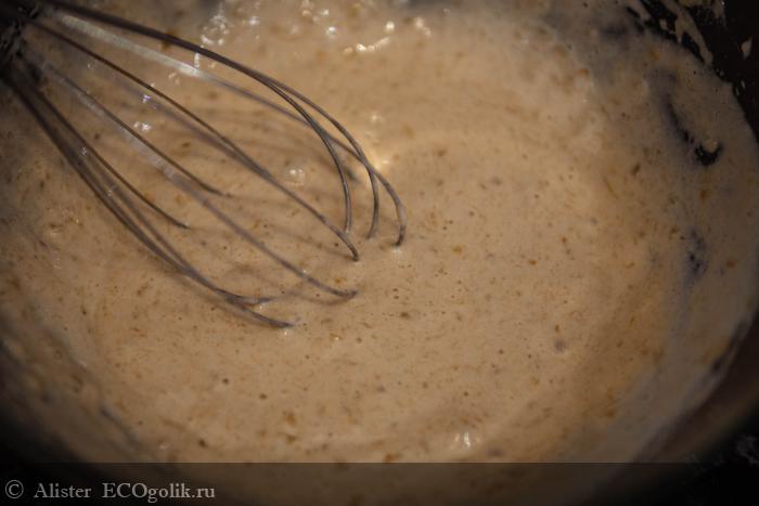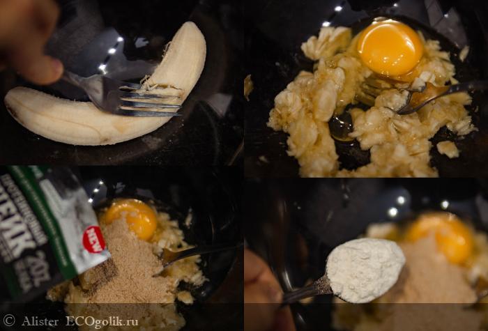 Я решила сначала протестировать рецепт и сделала пробную версию урезав наполовину объем продуктов. Размяла банан, добавила все ингредиенты и затем взбила миксером до однородной консистенции.