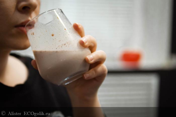 В консистенции тоже все на любителя и выпила я скорее залпом, нежели наслаждаясь. Мне не понравилась эта волокнистая текстура, особенно в купе с ароматизатором, но чего не сделаешь ради похудения) К тому же у меня появилось какое-то отвращение к молоку. Молоко животного происхождения я и так крайне редко употребляла в пищу, потому что не нравится вкус, но вот почему и к растительному появилась неприязнь, предстоит еще выяснять... В общем все сложилось против того, чтобы я насладилась полезным шейком в качестве ужина) Однако я продолжила пить через силу, ведь он на самом деле хорошо утоляет голод и увеличивает продолжительность чувства сытости. Я выпила его в семь часов вечера и к двенадцати часам ночи голод я не ощущала, благодаря чему легла спасть без похода к холодильнику. В следствии чего решила продолжать пить шейки вместо ужина, зажав нос и залпом.