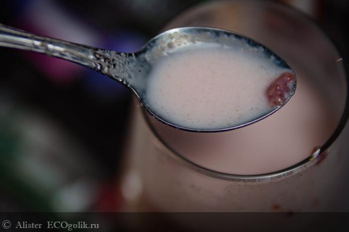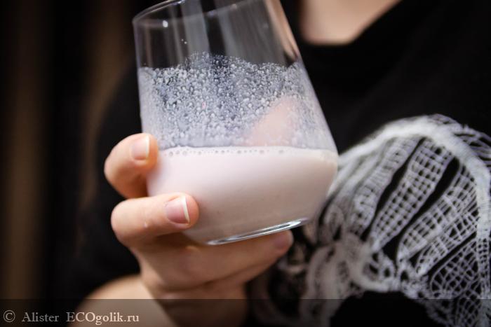 Молоко приобрело нежно-розовый цвет с небольшими вкраплениями и консистенция стала более вязкой и волокнистой, я бы сказала. Во вкусе присутствовала малина, которая немного сглаживала неприятную, для меня, консистенцию.