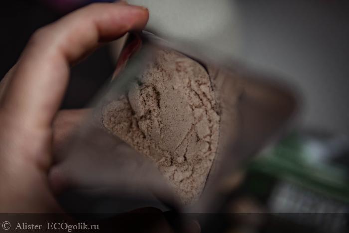 Порошок внутри упаковки однородного мелкого помола бледного серо-розового цвета с мелкими вкраплениями (по всей видимости) свеклы. Сразу чувствуется аромат. Забегая вперед, скажу, что у всех вариантов одна и таже ароматическая основа, которая дополняется соим солирующим, в зависимости от вариации шейка. Здесь я сначала услышала кондитерскую малину, а затем ужасно знакомый аромат, который долго не могла вспомнить. А потом поняла, что так пахнут все вафли, которые я так не люблю (знаете, те что спрессованы, многослойные брусочки). Учитывая то, что этот ароматизатор я не выношу, предположу, что там есть ненавистная мне ваниль и слишком сладкий пищевой шоколадный ароматизатор. Этот факт омрачил мне первую дегустацию. Здесь все индивидуально, но в моем случае ароматизатор испортил все. Однако, я не могла не попробовать.