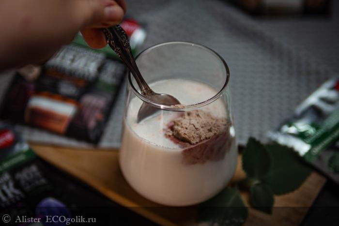 В этот раз размешать ложкой до однородной консистенции мне не удалось и, судя по всему, какао или шоколад всплывали наверх, не желая размешиваться. В отличии от предыдущих, этот шейк мне показался слаще, видимо из-за шоколада, из-за чего мне еще сложнее было его выпить. Еще раз повторю, это сугубо моя индивидуальная особенность, я ужасно привередлива в ароматах и вкусе, к тому же никогда не любила молочные коктейли, тем более шоколадные. Кому-то наверняка буде очень вкусно.