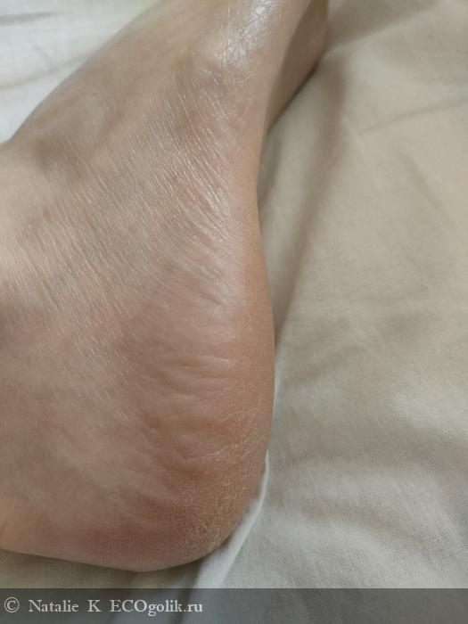 На этом фото видно, насколько суха кожа. Я специально не стала применять пемзу или щетки, просто приняла душ и нанесла крем, укутав ноги в пищевую пленку и потом в носки на пару часов. Смыла. Результат был заметен сразу: