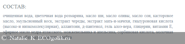 Очень радует состав. Разнообразие масел, присутствие геля алое-вера и гиалуроновой кислоты.