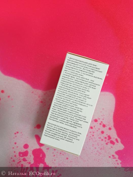 Азелаиновая и молочная кислоты эффективно борятся с пигментацией и акне, обладают противомикробной активностью, а также способствуют уменьшению содержания свободных жирных кислот в липидах кожи и нормализуют нарушенные процессы кератинизации в фолликулах сальных желез.